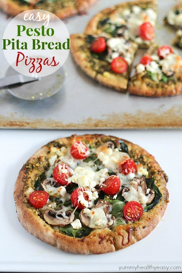 These Easy Pesto Pita Bread Pizzas use pita bread as the crusts and are spread with pesto and topped with veggies. Delicious and healthy lunch, dinner or snack!