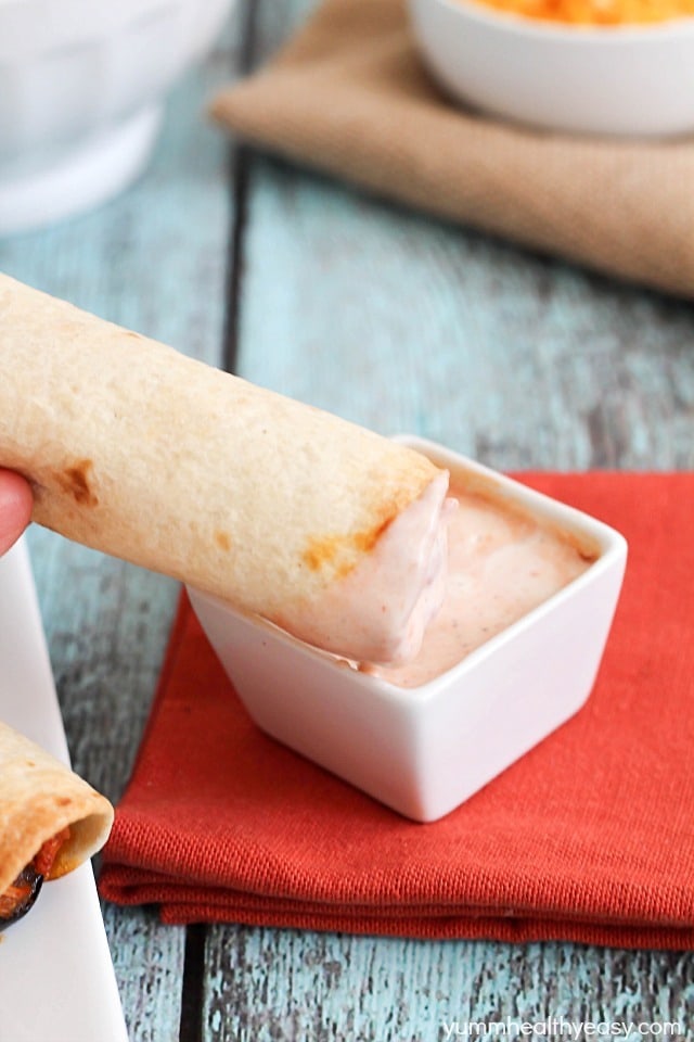 My husband definitely loves these taquitos and so do my boys! It’s fun to have something portable that you can pick up and eat on the go and the sauce is super delicious and so easy! I just mixed a little ranch and taco sauce and it seriously makes the best dip for your taquitos!