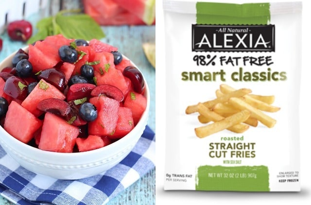 Serve with a basket of Alexia Smart Classic Straight Cut Fries (98% fat free and only 100 calories per serving!) and Watermelon Fruit Salad.