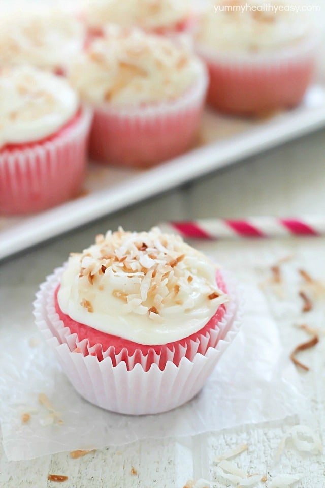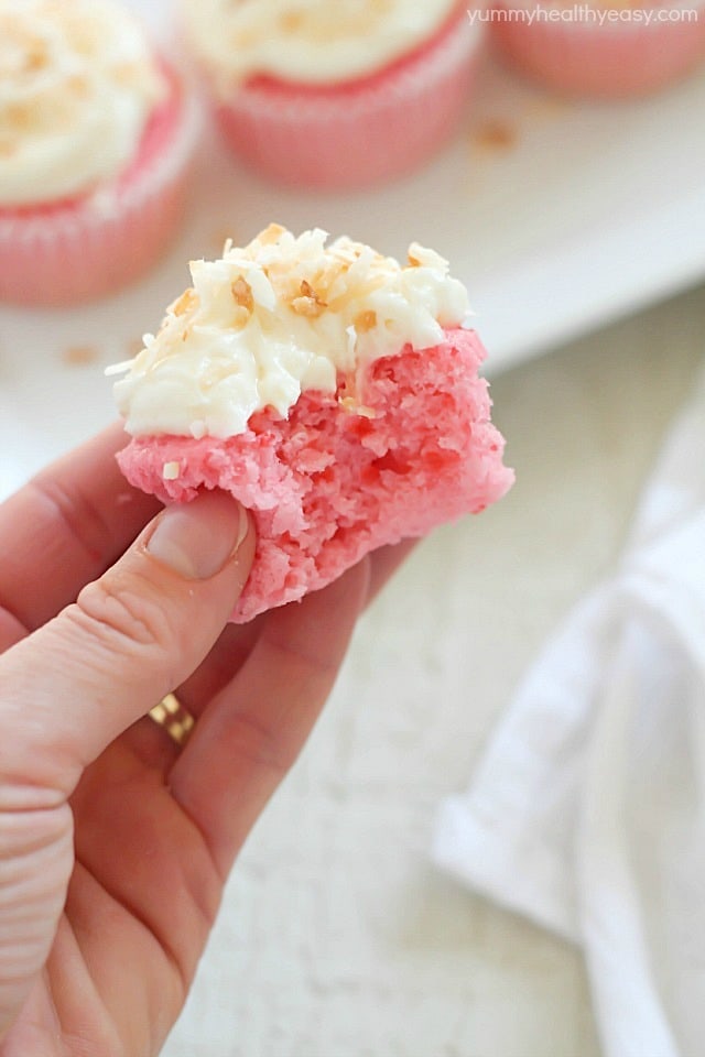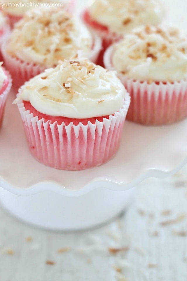 These are so pretty, Jen! I just love the pink color, and the coconut addition with lemon cream cheese frosting — delicious!