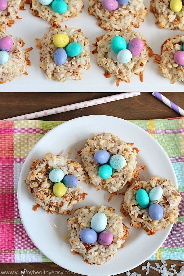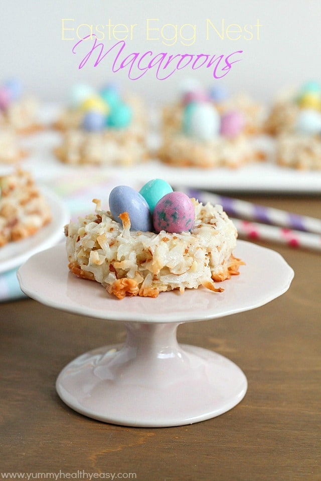 Darling and delicious little nests made out of easy macaroons and then topped with M&M Easter egg candies!