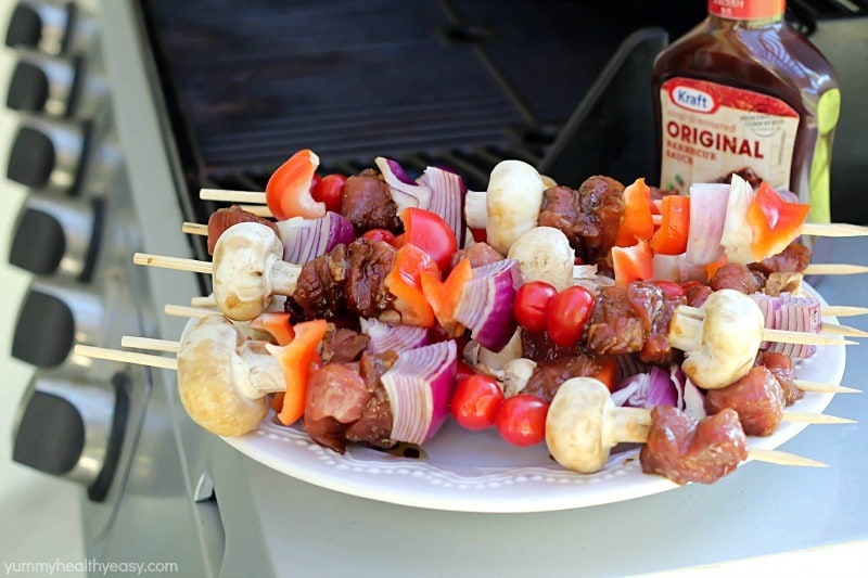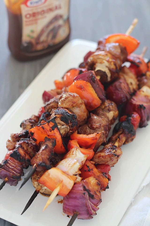 One of my favorite grilled dishes are shish kabobs. I love just about anything grilled on a stick and slathered in barbecue sauce. These kabobs are just that. Marinated, tender pork and crispy-soft vegetables doused in Kraft’s new Original Barbecue Sauce.