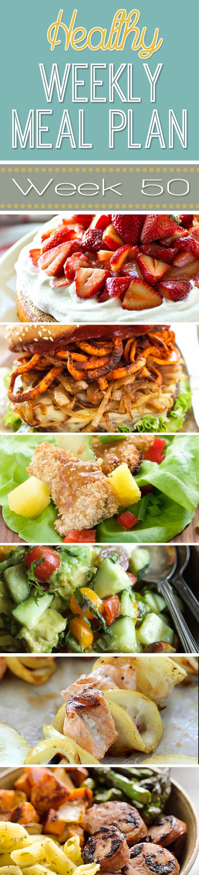 Healthy Weekly Meal Plan #50 is filled with healthy main dishes to add to your dinner rotation. Plus a breakfast, lunch, snack and even an amazing dessert, too! Just click on the photo or the text link to take you straight to the recipe. Enjoy!!
