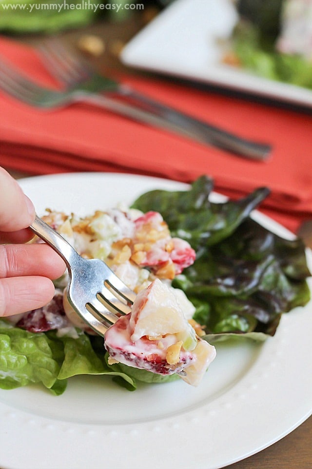 I lightened the traditional recipe up a bit by adding non-fat yogurt in place of the mayo and also added strawberries because, why not?! They add a great softer texture to the crunchy apples and celery.