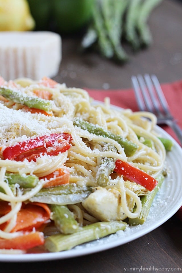 Pasta Primavera lightened up and filled with veggies for a healthy and light meatless dinner!