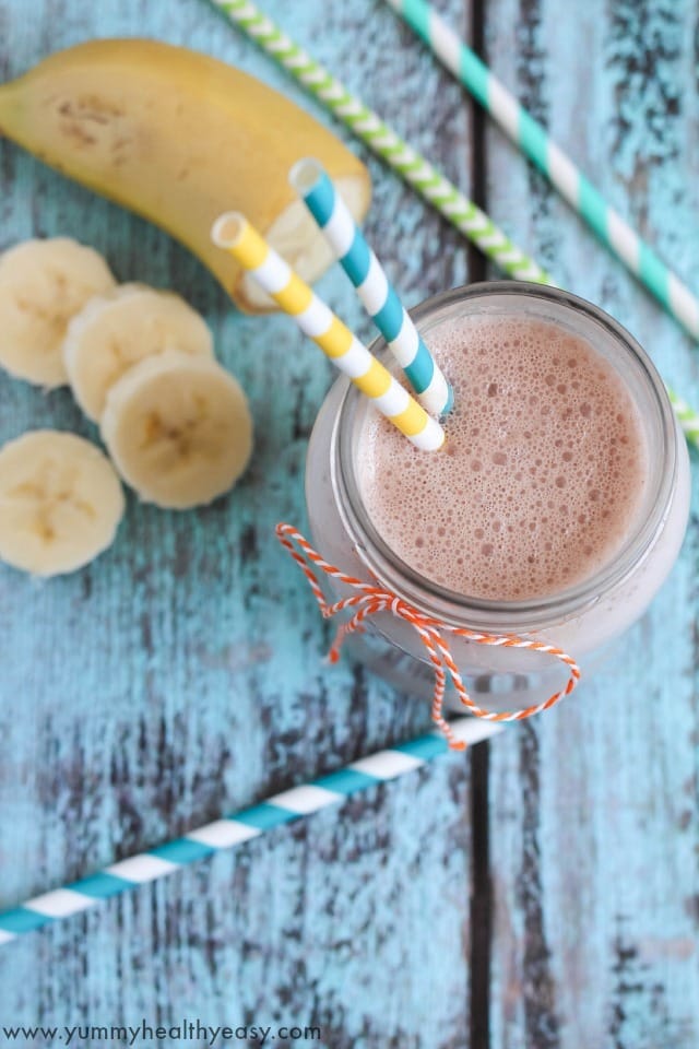 Peanut Butter Banana Smoothie | four ingredients to make a refreshing, delicious smoothie! Can add chocolate syrup or chocolate protein to make it into a Peanut Butter Banana Chocolate Smoothie, too!