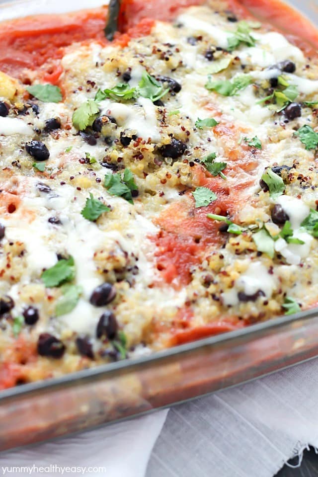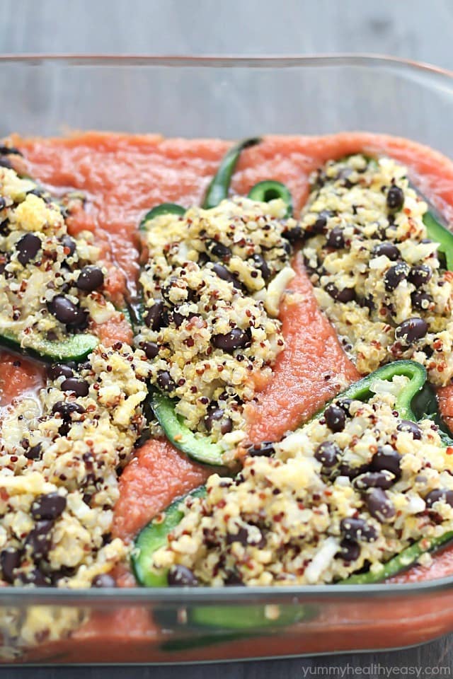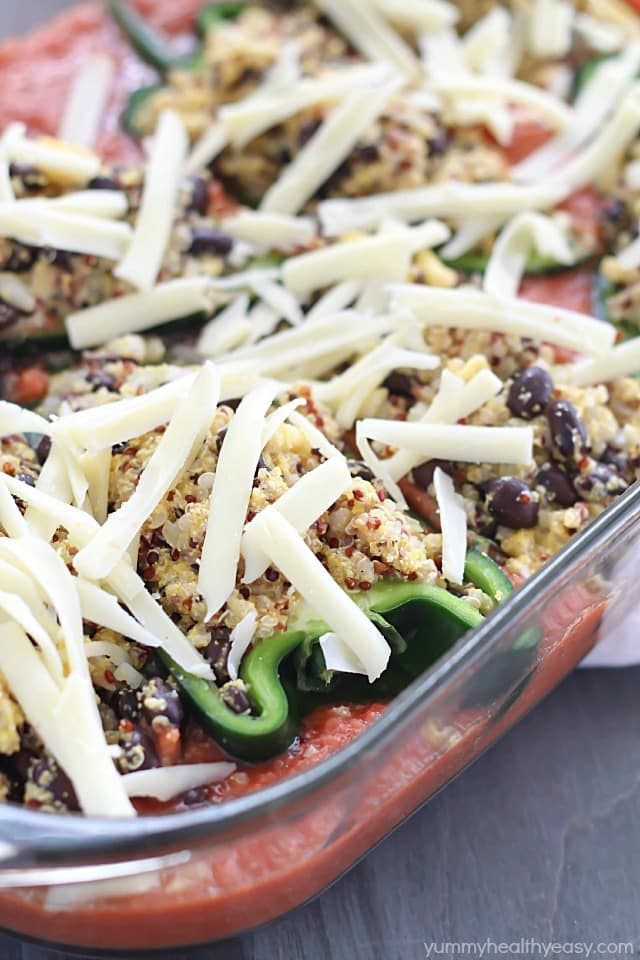 - Stuff each half pepper with quinoa mixture and place in tomato sauce in baking dish. Top each pepper with cheese.