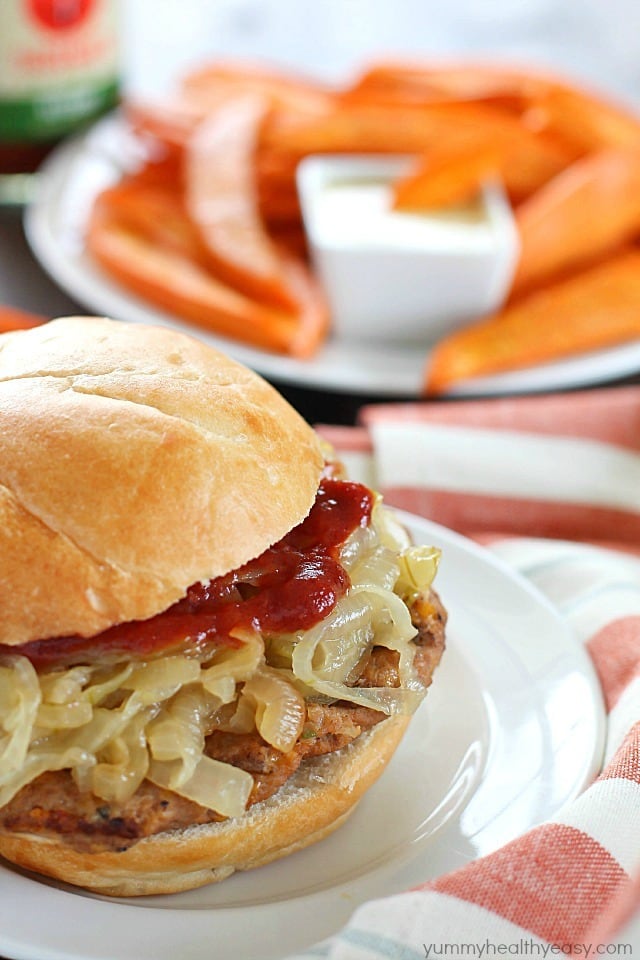 Get ready for the most flavorful spicy turkey burgers with a slathering of caramelized onions on top! Serve with a side of oven baked sweet potato fries (wedges) dipped in a spicy mayo sauce – absolutely divine! (This is a sponsored conversation written by me on behalf of Tessemae’s. The opinions and text are all mine.)