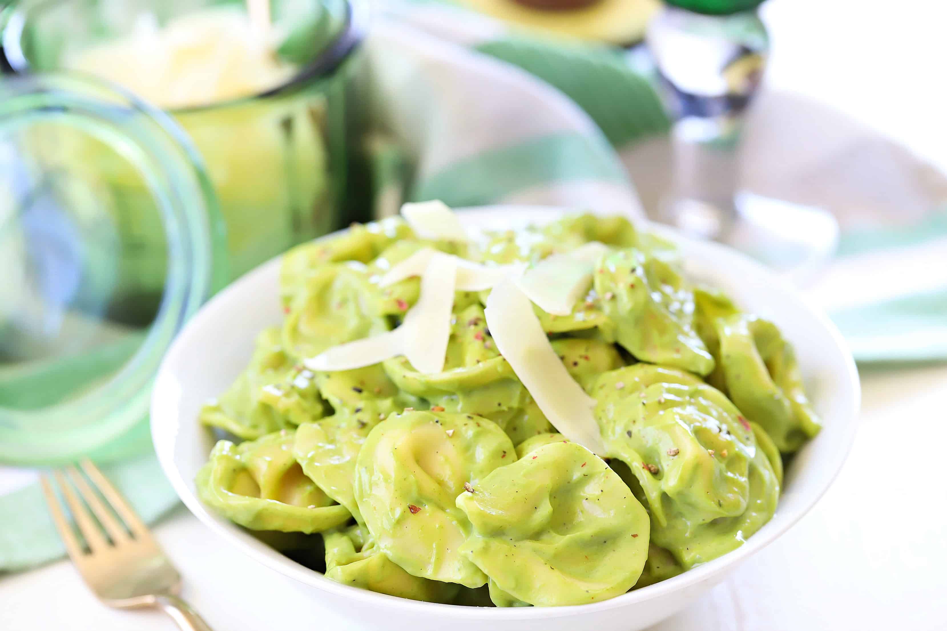 Seriously, just look at that gorgeous creamy green color. What’s not to love?! We happen to love tortellini but this sauce works great with any pasta.