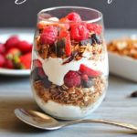 • When ready to assemble, place yogurt in bottom of glass. Add a layer of granola, then chopped dark chocolate, then berries and repeat. Dig in and enjoy!